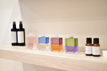 当院では治療前のリラクゼーションと、治療後のリフレッシュをもたらすアロマテラピーを取り入れております。アロマテラピーに用いられるエッセンシャルオイル(精油)とは、植物の花や葉・果皮・樹脂などから有効